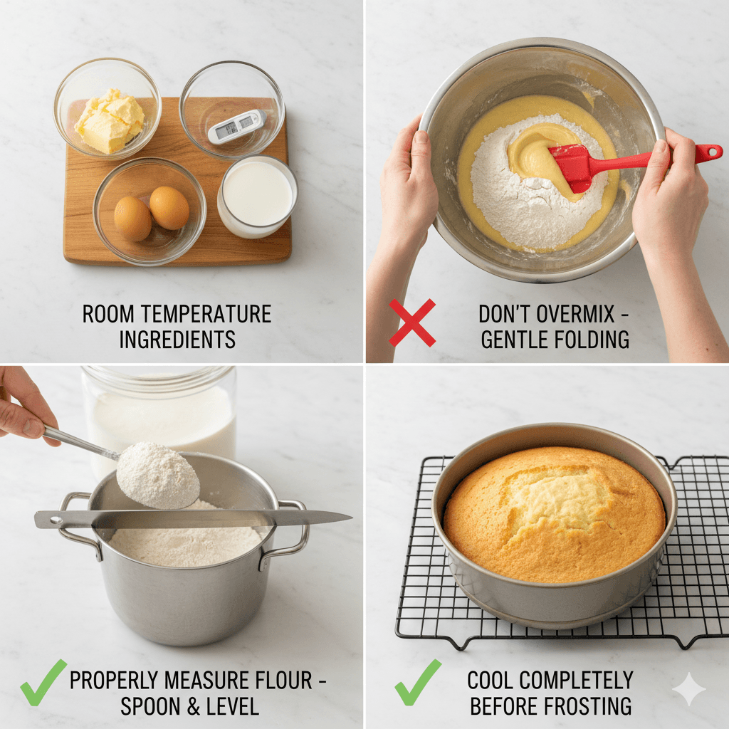 The Golden Rule: Overmixing develops gluten, resulting in a tough, dense cake. Mix gently and minimally.